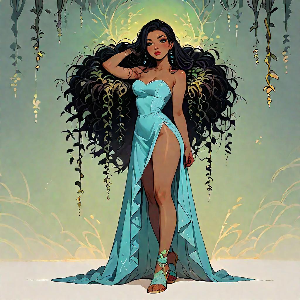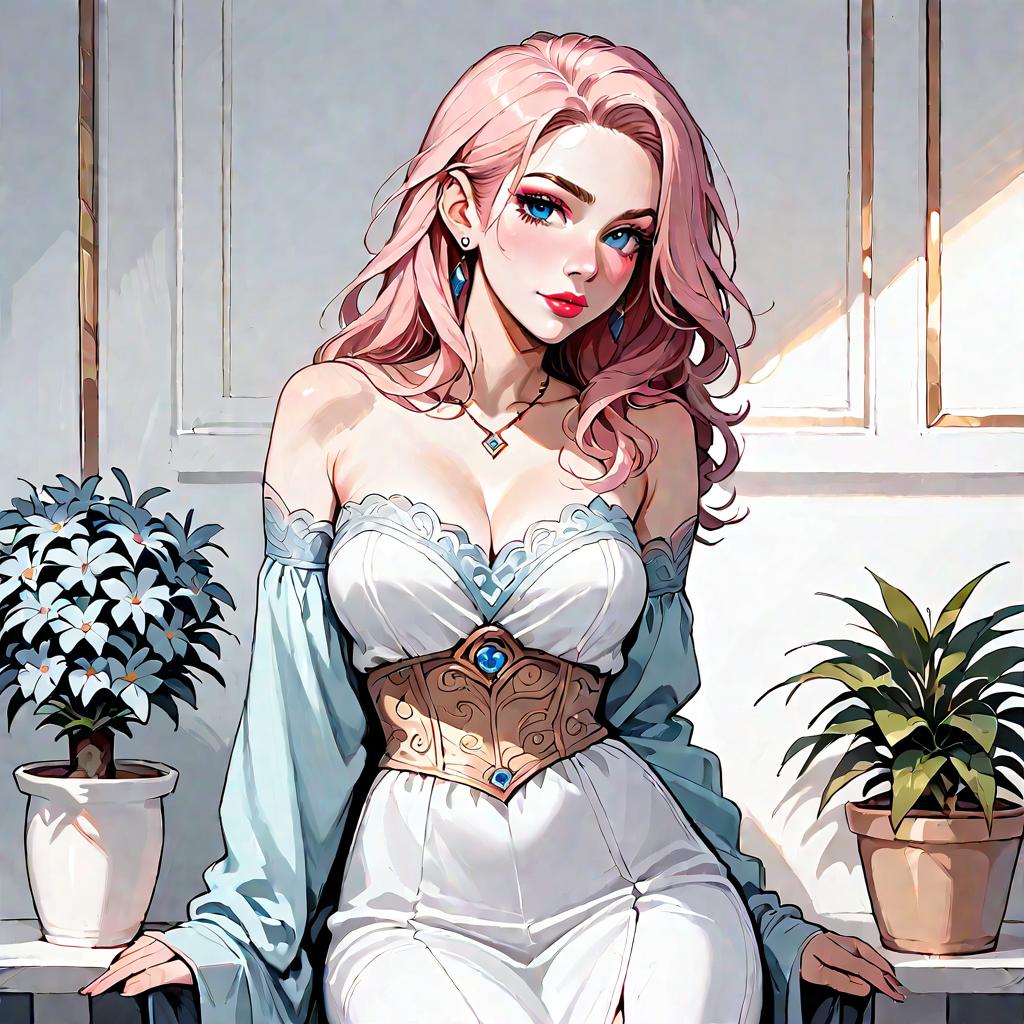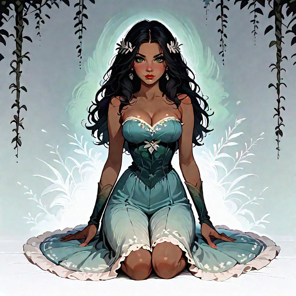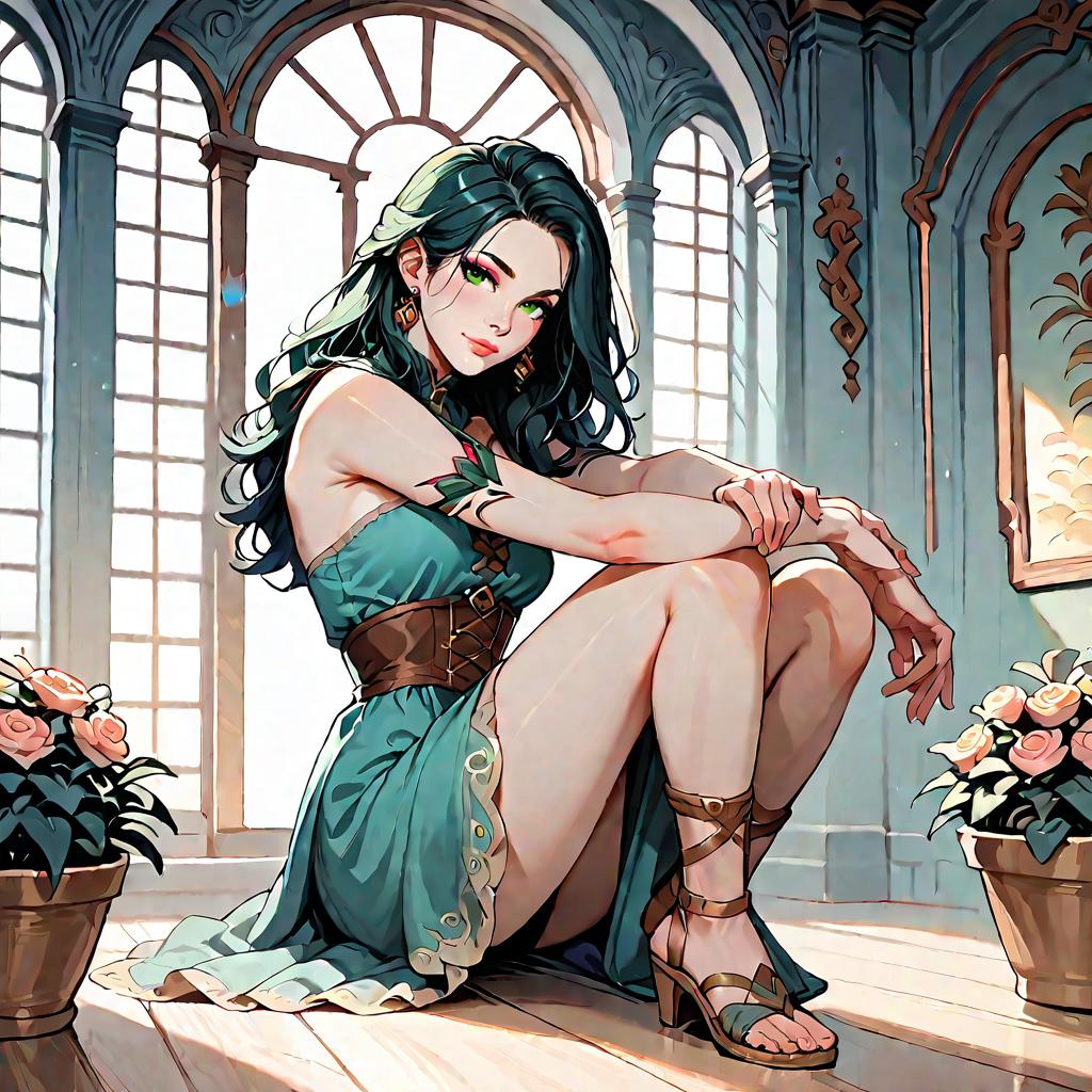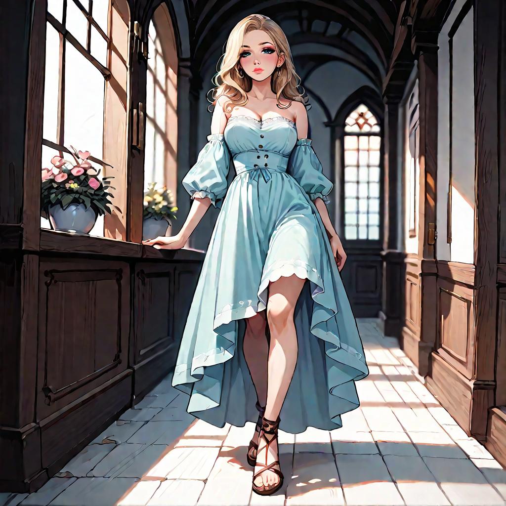 Illustration of a woman with olive skin and straight dark hair wearing a strapless smocked-bodice tiered maxi dress in light blue with lace-trimmed hem and a high side slit. She is seated on a whitewashed Mediterranean-style stone staircase adorned with climbing green vines, wearing minimalist strappy sandals. The setting features soft natural daylight and detailed architectural elements.