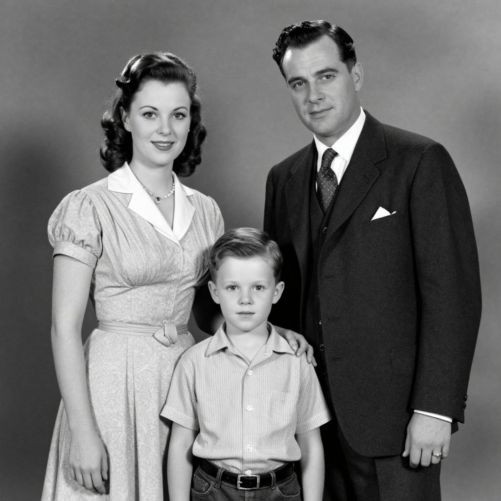 Black-and-white photograph of 1950s family: smiling woman in dress, serious man in suit, and boy in striped shirt, standing together.