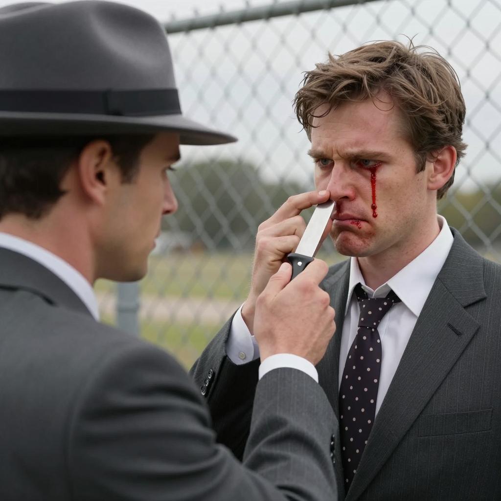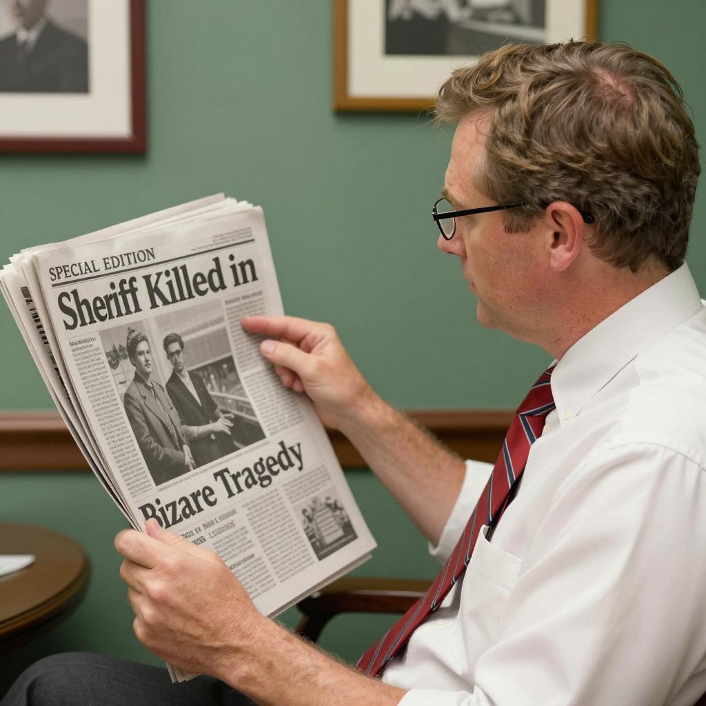 Man with glasses and light brown hair reads newspaper. He wears a white shirt and red-striped tie. Newspaper headline: "SPECIAL EDITION, Sheriff Killed in Bizarre Tragedy." Background includes green wall with framed pictures. Man's right hand points at headline. His profile is to the left. Bright lighting. Indoor setting.