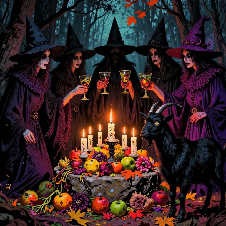 A coven of dark-robed witches gathered around a harvest altar in a shadowed glade, their faces hidden beneath wide-brimmed hats and heavy, laced collars, In the center, a stone slab is covered with enchanted fruits, decayed flowers, and candles carved with ancient symbols, A black goat with sharp, intelligent eyes stands beside the altar, watching the proceedings with an unsettling awareness, The witches raise goblets in a toast, chanting in hushed voices to invoke the spirits of the dark harvest, Vibrant, grotesque, and surreal with bold contrasts, heavy black outlines, and a blend of dreamlike autumnal hues; a mix of neon, retro, and pagan elements, inspired by Sean Aaberg’s punk-infused, chaotic energy and dreamcore's eerie, nostalgic undertones