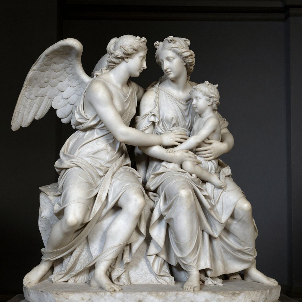 Classical marble sculpture depicts three figures—a winged angel, a seated woman, and a child—engaged in a tender interaction, with the angel cradling the child while the woman supports them both, all draped in flowing robes against a dark background.