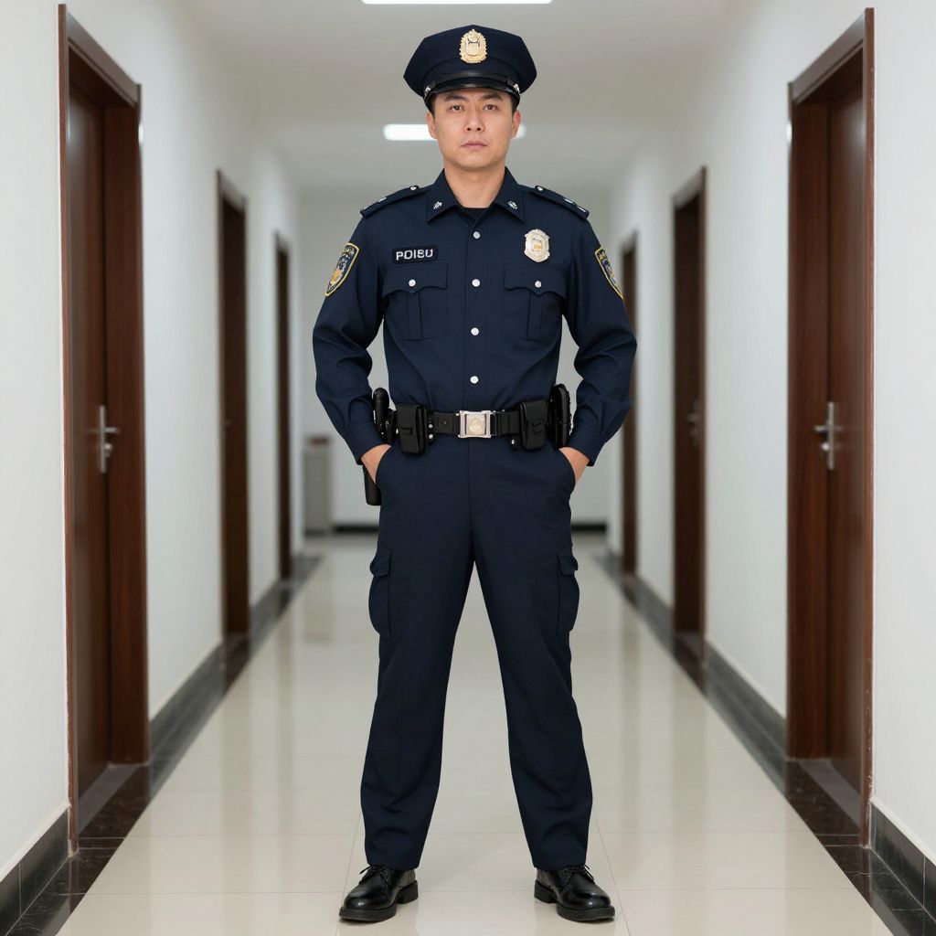 Photograph of a young, Asian male police officer standing confidently in a brightly lit, narrow hallway with white walls and dark wooden doors on either side. He is wearing a dark navy blue uniform with a badge, "POLICE" patch on the left sleeve, and a silver belt with a rectangular buckle. His hands are in his pockets, and he has a serious expression. The floor is glossy white tile, reflecting light, and he wears black shoes. The officer's hat has a shiny silver badge on the front. The hallway is symmetric, creating a centered focus on the officer.