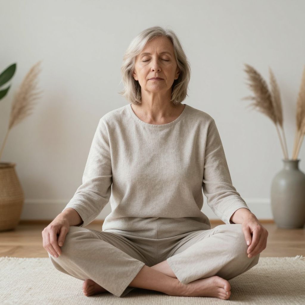 In a serene embrace of stillness, a senior woman sits cross-legged, her eyes closed in quiet reflection, as the gentle hum of life and the soft scent of earthy plants envelop her, symbolizing a profound connection to inner peace and the timeless flow of existence.