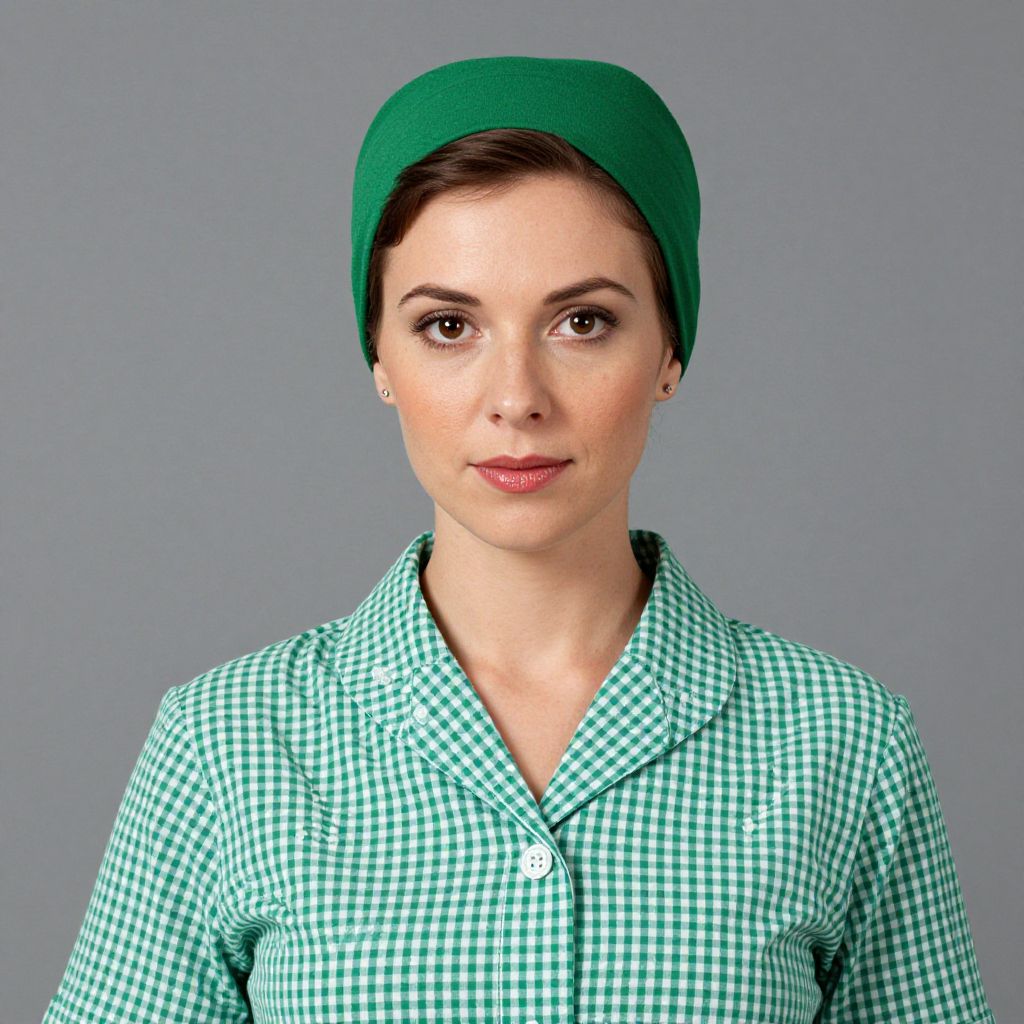 A woman wearing a midcentury-style green turban and a green gingham 1940s-style work blouse.