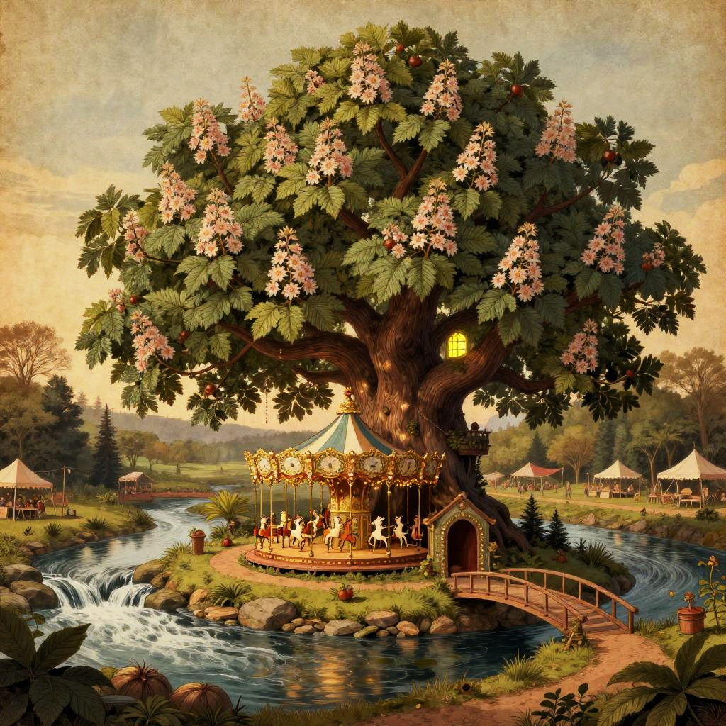 Anton Pieck style illustration of a woodland puppet theatre and clockwork carousel woven into a flowering chestnut tree, large continuous tree, leafy roof, inviting entrance with bridge, connected paths, in a riverside festival grove at dusk, flowing stream, waterfall, vintage paper texture, intricate line work, high detail, mystical atmosphere, warm and nostalgic tones, soft lighting, high quality, warm window lighting