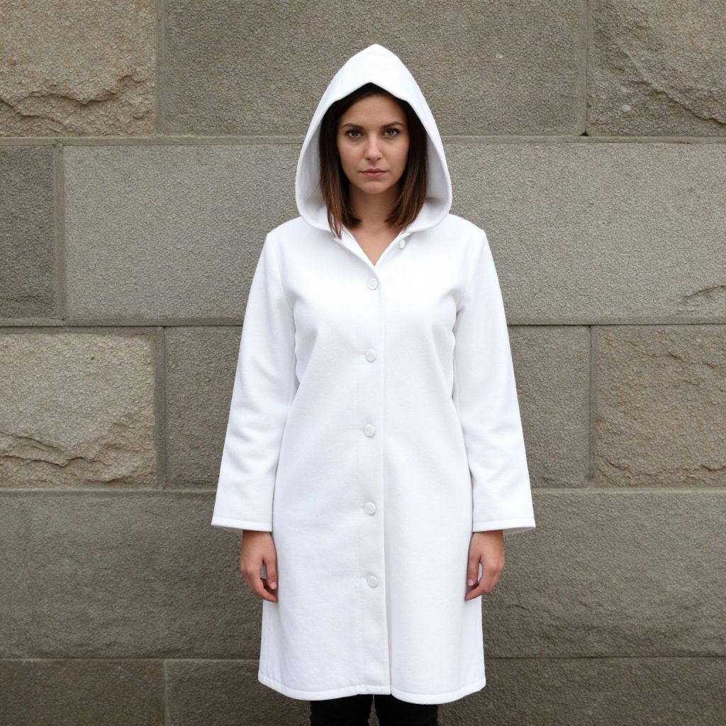 A woman wearing a simple white hooded coat stands against a textured stone wall. The coat is buttoned down the front and has a clean, minimalistic design. The woman has straight, shoulder-length brown hair visible under the hood and a neutral expression.