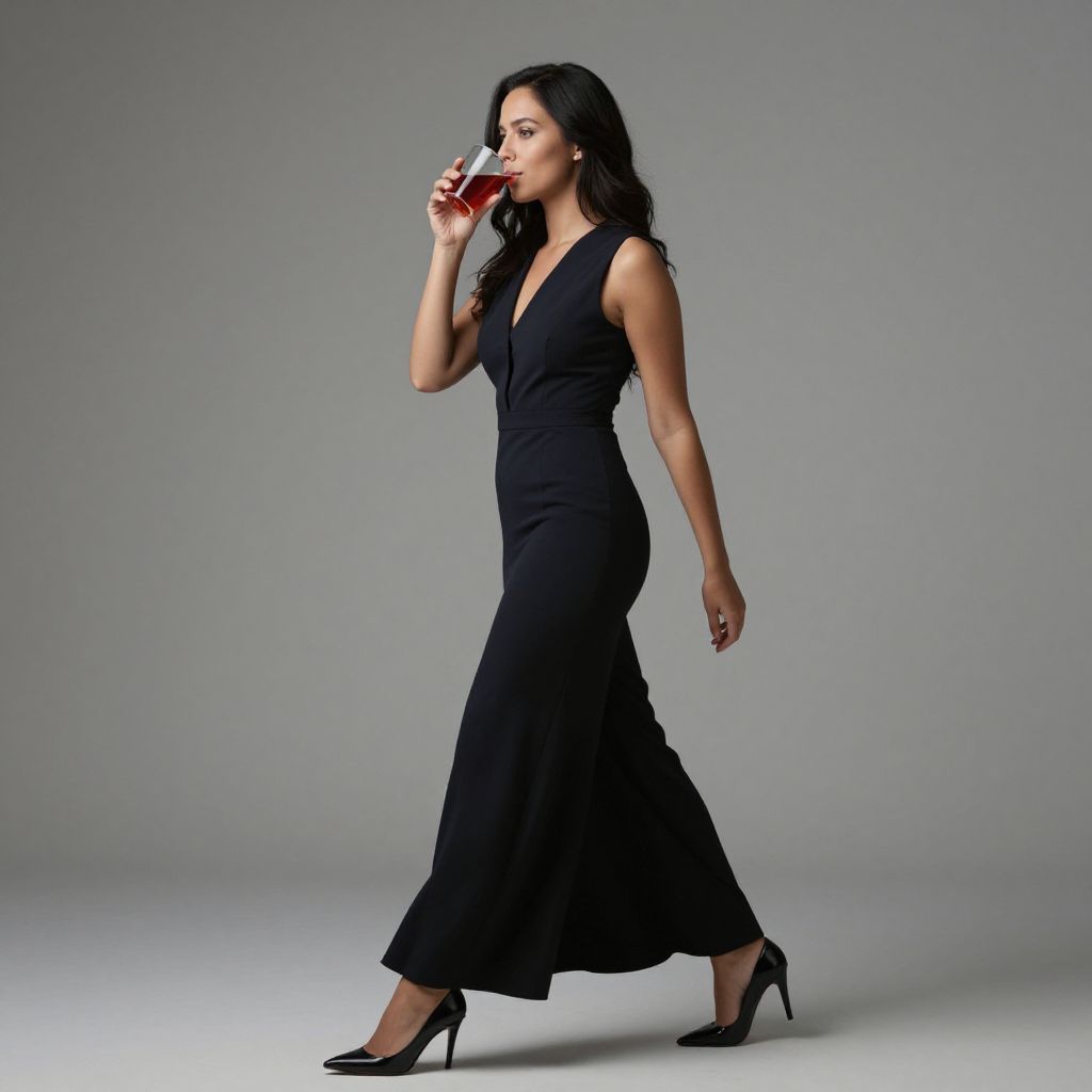 Photograph of a slender, dark-haired woman with medium brown skin, wearing a sleeveless, deep V-neck, black evening gown that flows to her ankles, and black high-heeled shoes. She is walking to the right, sipping from a red wine glass held in her right hand. The background is a simple, gradient gray, and the lighting highlights her elegant figure and the fabric's smooth texture. Her expression is confident and poised.