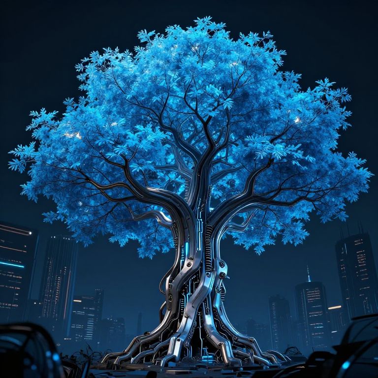 A digital artwork depicts a glowing, blue-lit tree with intricate, twisted branches and detailed, root-like base. The tree's vibrant blue leaves contrast against a dark, futuristic cityscape in the background, featuring tall, illuminated skyscrapers. The tree's textures are smooth with a metallic sheen, while the leaves are delicate and feathery. The image has a neon, cyberpunk style with high contrast and vivid colors, emphasizing the tree as a central, luminous focal point amidst the dark urban environment.