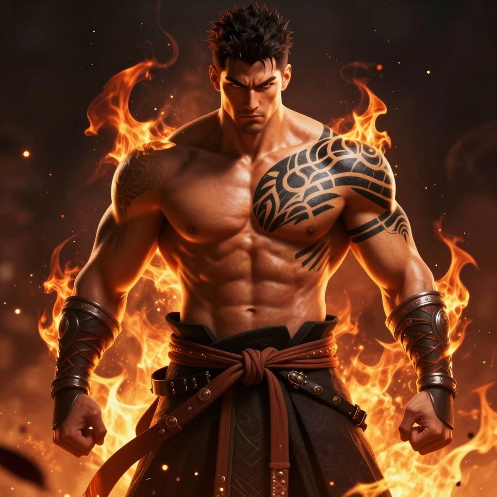 A powerful, muscular man stands poised with intense determination, surrounded by dynamic flames and glowing embers. The image features a highly detailed digital artwork style with dramatic lighting emphasizing the man's chiseled physique and tribal chest tattoo, blending elements of fantasy and warrior aesthetics.