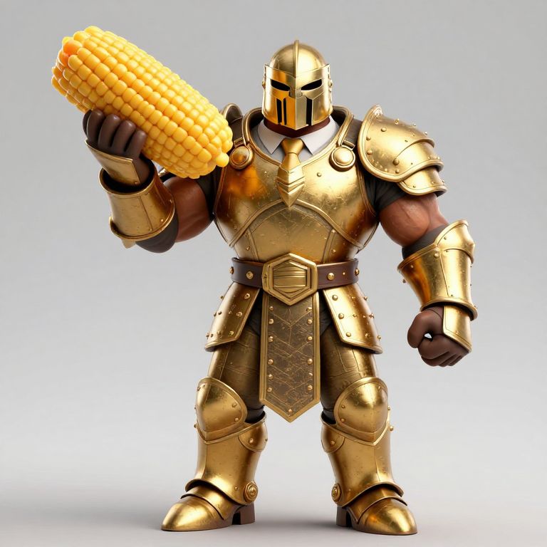 Digital artwork of a muscular, golden-armored knight holding a corn on the cob in his right hand, standing against a light blue gradient background.