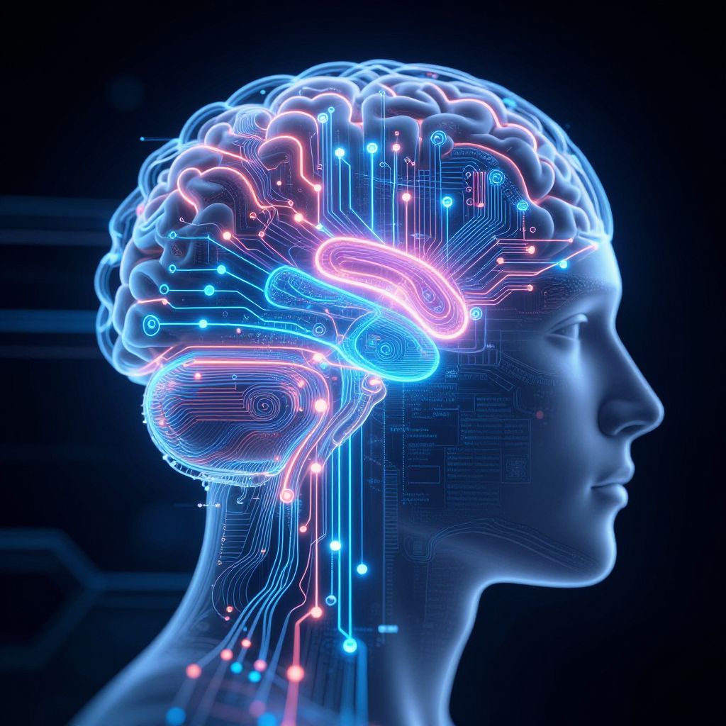 A digital CGI illustration of a human head in profile, illuminated with neon blue and pink circuitry patterns. The brain is prominently highlighted with intricate, glowing lines and nodes, suggesting neural activity. The dark, black background contrasts with the bright, luminescent details of the brain and head. The subject's features are subtly outlined in blue, blending into the circuitry. The overall style is futuristic and cybernetic, emphasizing the intersection of technology and biology. The image evokes a sense of modern, high-tech neuroscience or artificial intelligence.