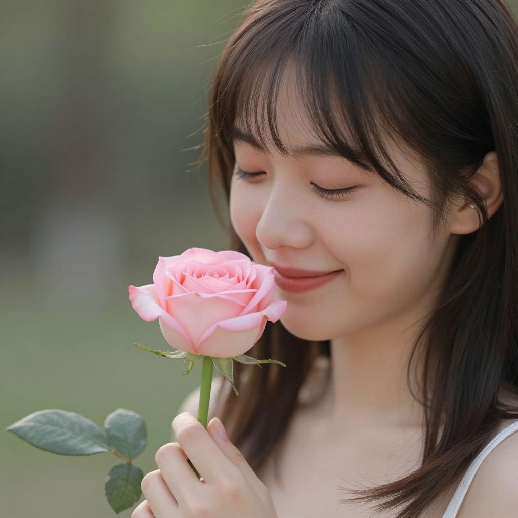Photograph of an Asian woman with long, dark brown hair and fair skin, gently smelling a pink rose she holds close to her face. She has closed eyes, a soft smile, and wears a white spaghetti-strap top. The rose has delicate, soft pink petals and a green stem. The background is a plain, light beige wall, creating a minimalistic and serene atmosphere. The woman's delicate features and the soft lighting emphasize the gentle, intimate moment.