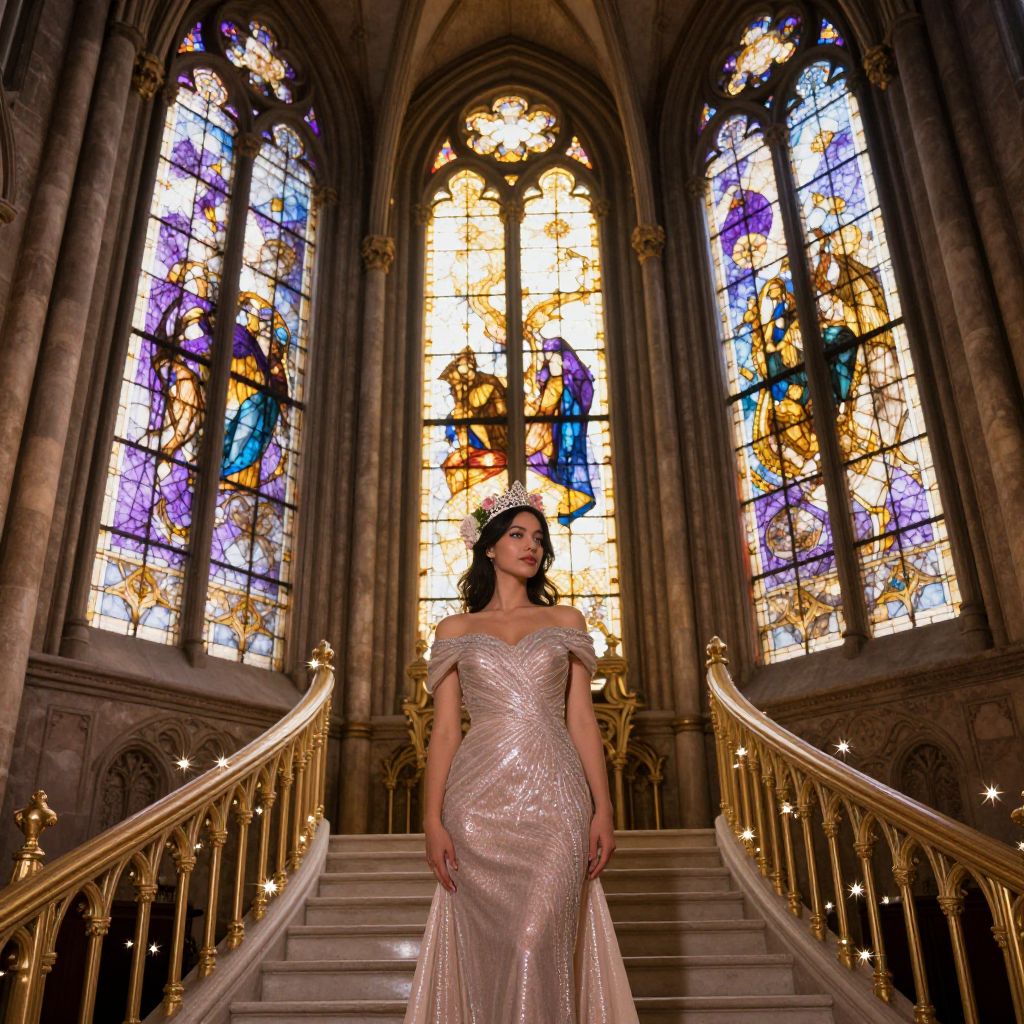 In this captivating image, a woman stands gracefully in an intricately detailed old cathedral, her presence framed by the grandeur of the architecture. She is adorned in a shimmering, off-the-shoulder dress, its fabric catching the light, and a delicate tiara graces her head, adorned with flowers that add a touch of nature's beauty. The cathedral's stained glass windows, a masterpiece of artistry, dominate the background, their vibrant colors of white, lilac, and yellow casting a warm, ethereal glow. The cathedral's sweeping staircase, adorned with sparkling lights and tiny stars, ascends majestically, leading the eye towards the woman. The overall composition is a harmonious blend of human elegance and architectural splendor, with the woman positioned centrally, her figure aligned with the grandeur of the cathedral, creating a sense of balance and symmetry. The interplay of colors, textures, and shapes creates a visually rich and dynamic scene, capturing the essence of both the woman and the cathedral.