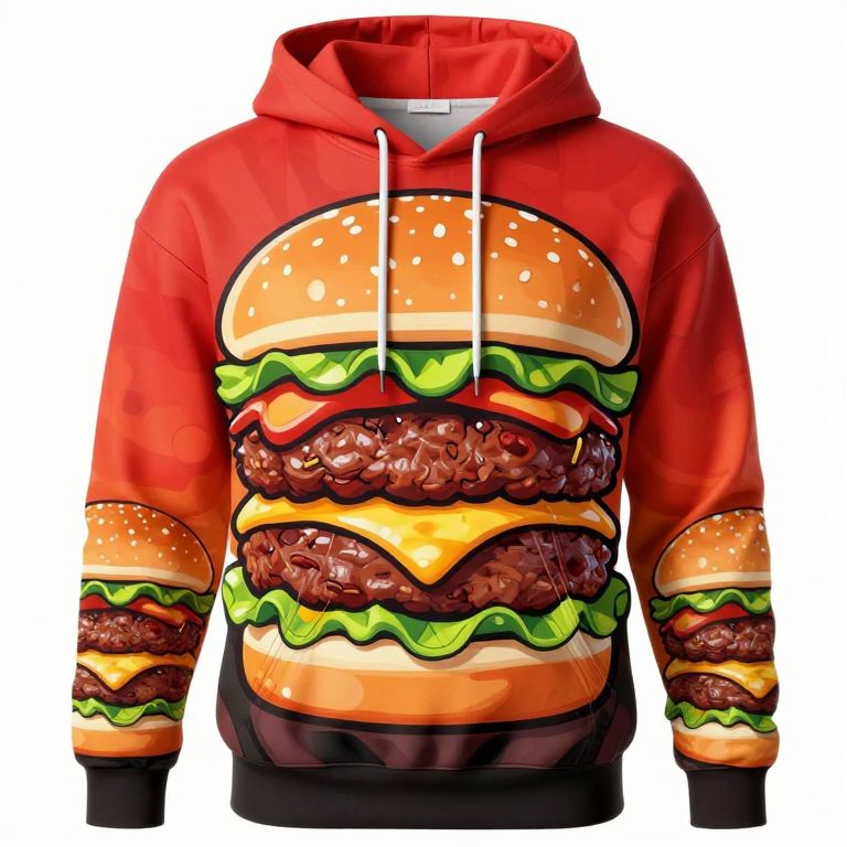 A vibrant 3D-printed hoodie featuring a playful and detailed hamburger-themed design, showcasing layers of patties, lettuce, cheese, and sauce in a cartoonish, pop-art style, rendered with high-definition graphics for a bold and eye-catching aesthetic.