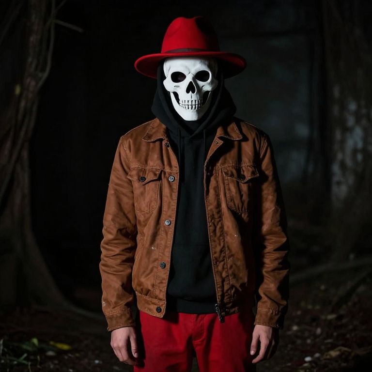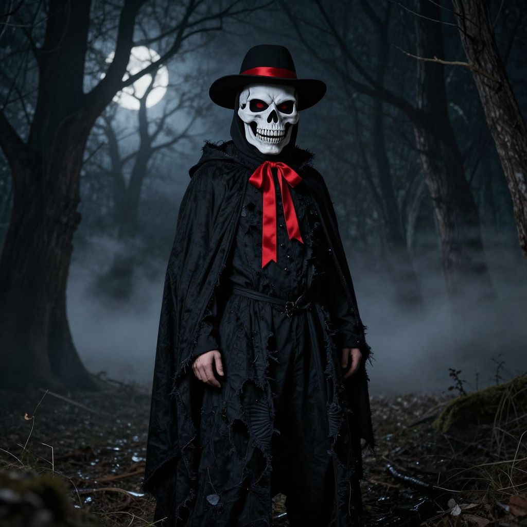 A person wearing a skull mask, standing in a sunlit desert landscape, dressed in a black shirt, a traditional sombrero with a wide brim, and a black scarf wrapped around their neck. The person has a rugged, weathered appearance with sun-kissed skin and sharp, intense eyes, exuding a mysterious and timeless aura. The background features golden hour lighting, with distant cacti and a horizon line blending into the sky, creating a dramatic and atmospheric scene.