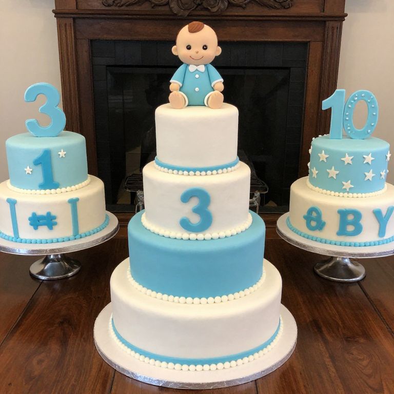 Three decorative baby shower cakes in blue and white theme. The central cake is a four-tier design with a fondant baby topper, featuring the number 3. The left cake is two-tiered, with the number 1 and the symbols '#3'. The right cake is also two-tiered, decorated with stars and the number 10, along with the word 'BABY'. All cakes are displayed on metal cake stands on a wooden table.