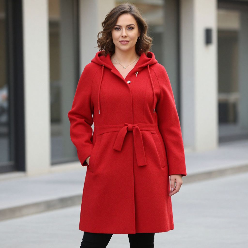 Photograph of a confident woman with wavy brown hair, wearing a vibrant red, hooded, knee-length coat, standing on a city sidewalk.