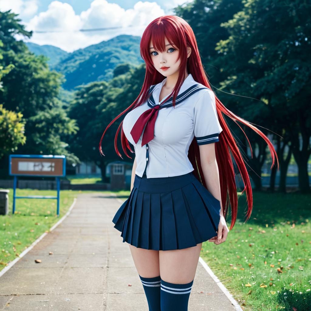 Masterpiece, best quality, highres, rias gremory, 1girl, long hair, school uniform, red hair, ahoge, blue eyes, large breasts, very long hair, breasts, skirt, huge ahoge, socks, standing, outdoors