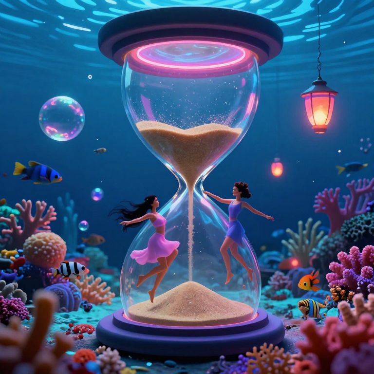 A mesmerizing digital artwork captures an enchanting underwater ballet, where fantastical creatures engage in a whimsical dance amidst vibrant, neon bubbles and glowing lanterns. These luminescent elements cast an otherworldly glow on their surreal surroundings against the backdrop of a thriving coral reef teeming with exotic marine life. From an unconventional vantage point, viewers are immersed beneath the ocean's surface to witness this wondrous scene unfold, as time appears to bend within a colossal hourglass whose sand flows both forward and backward in a hypnotic loop. The piece exudes a sense of wonder and philosophical contemplation about perception and reality, inviting audiences on an enthralling journey beyond conventional boundaries.