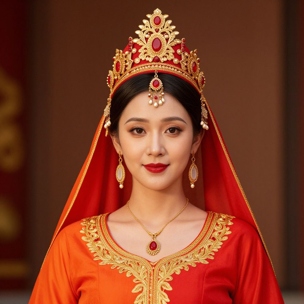 A woman is wearing a traditional red and gold outfit with a matching headdress. The headdress is adorned with a large, ornate crown and earrings. The woman is also wearing a pair of earrings and a necklace. The outfit is orange and red, with a gold embroidery on the neckline.