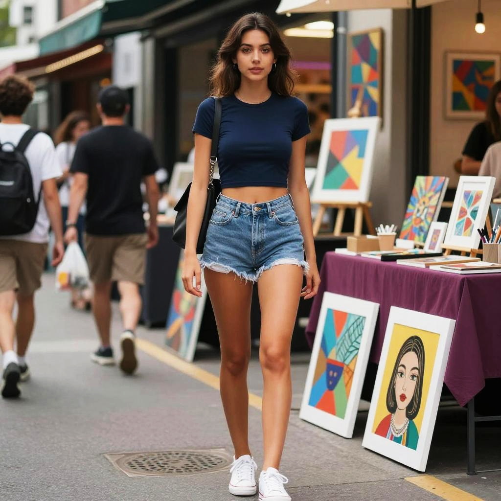 A tall woman in casual streetwear, wearing a black striped T-shirt featuring a white bird graphic and light blue frayed denim shorts, stands in a historic street in Rome with ancient ruins. The scene is illustrated in the style of Kodansha comics. Sexy. Pretty face and beutiful eyes