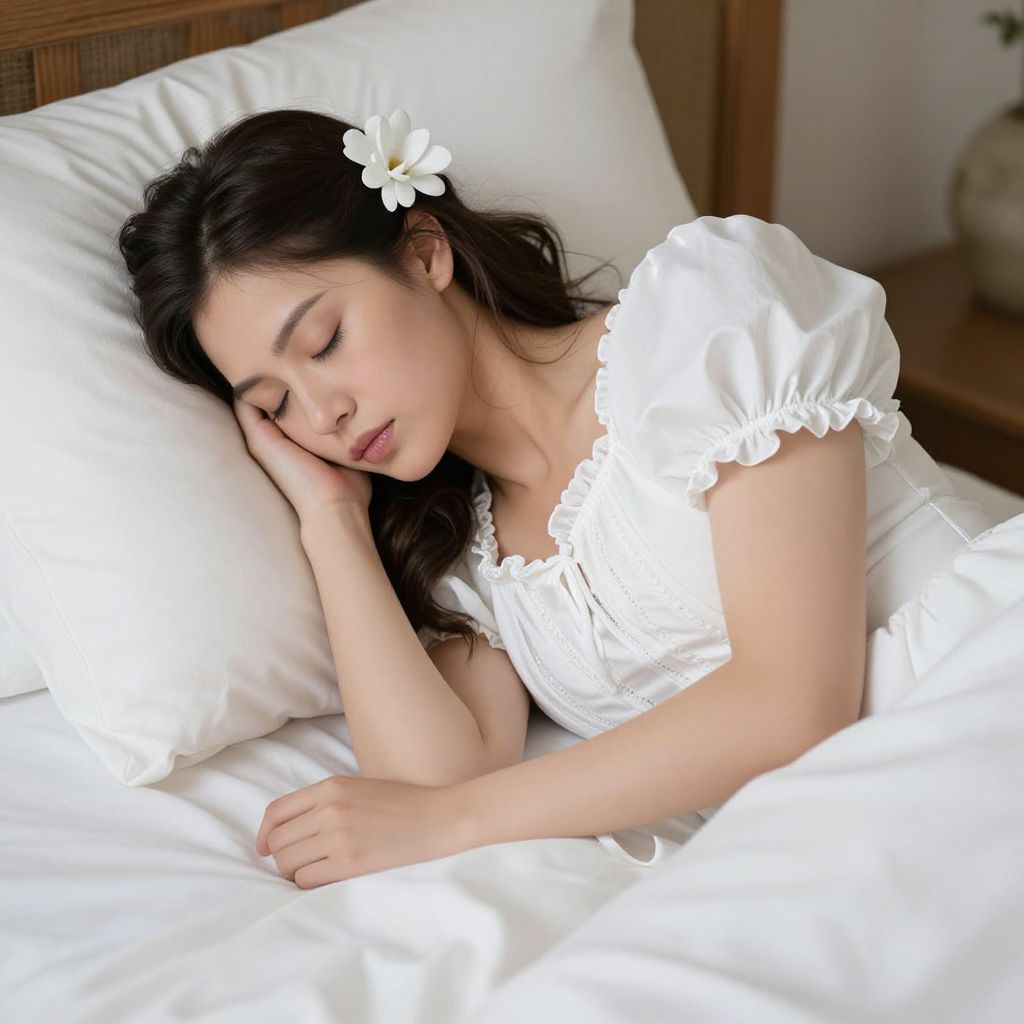Photograph of an Asian woman with long, dark hair, sleeping peacefully on a bed. She wears a white, short-sleeved, ruffled dress with a delicate white flower in her hair. Her eyes are closed, and she rests her head on a white pillow with one arm under her head. The bed has white sheets and a wooden headboard is visible in the background. Soft natural light illuminates her fair skin, creating a serene and tranquil atmosphere. The image focuses on her calm expression and the simplicity of the white bedding and dress.