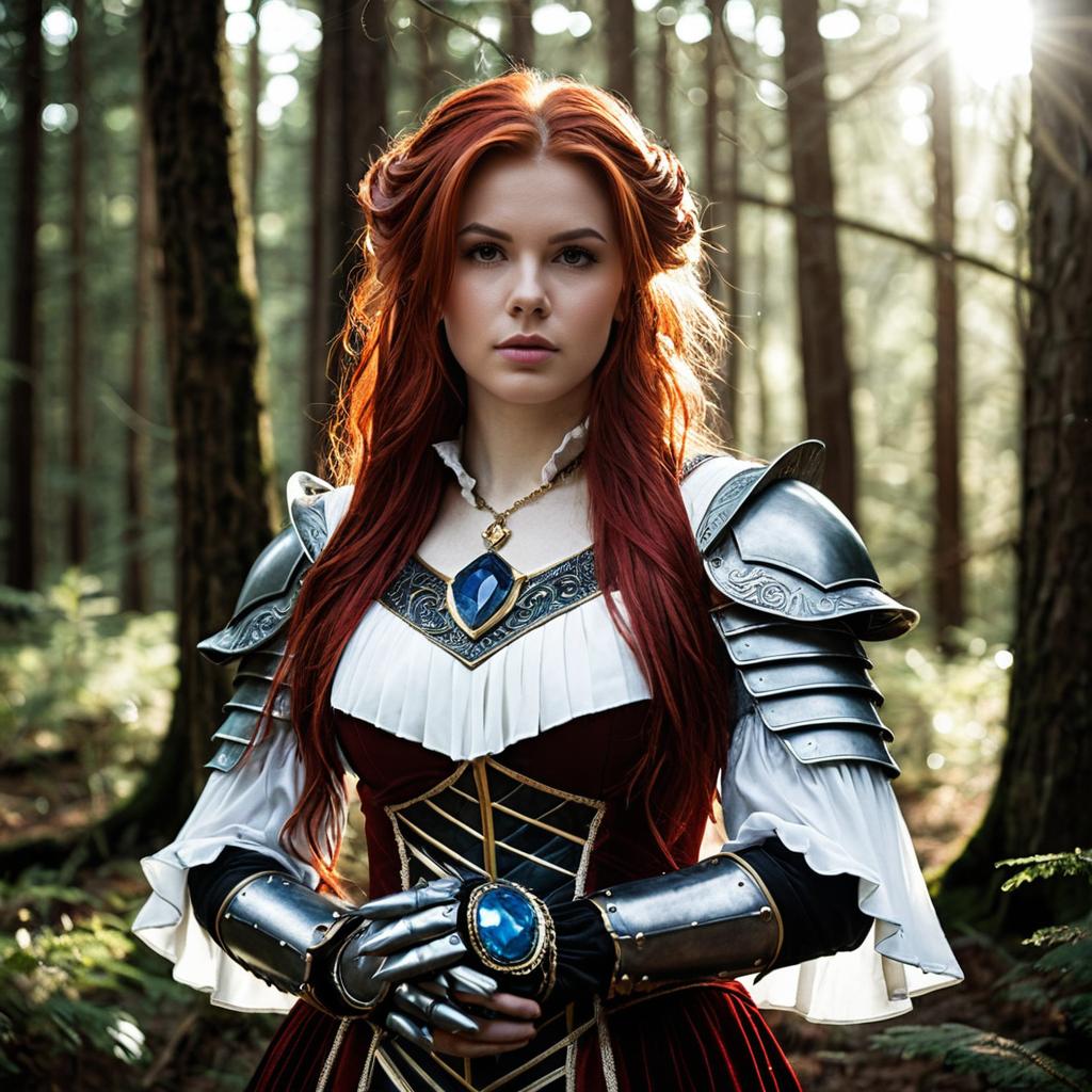 Portrait of a young woman with red braided hair wearing a teal tunic, brown leather straps, red cape, and a choker necklace standing in a forest. Natural sunlight filters through the trees, creating a cinematic bokeh effect in the background. The woman has a serious expression, and the detailed clothing and accessories reflect a fantasy character style.