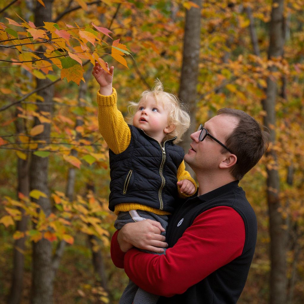 Photograph of a smiling man with glasses holding a blonde toddler in a black vest, reaching for autumn leaves in a colorful forest.