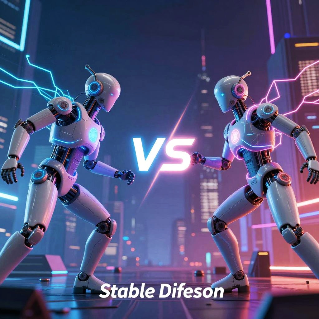 Dalle 2 vs stable diffusion, futuristic scene showing two AI systems as glowing neural networks battling inside a digital cityscape, vibrant colors highlighting technological contrast, cyberpunk style art with sharp, dynamic lighting.