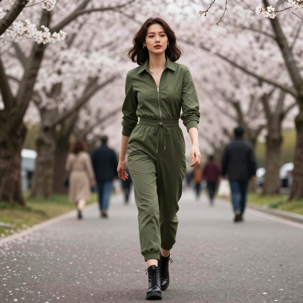 A woman in an olive green jumpsuit, tailored fit with a front zip closure and long sleeves, cinched waist with drawstring, and black lace-up ankle boots, depicted in the visual style of nbm graphic novels, enjoying an evening stroll in the cherry blossom grove. Sexy. Pretty face and beutiful eyes