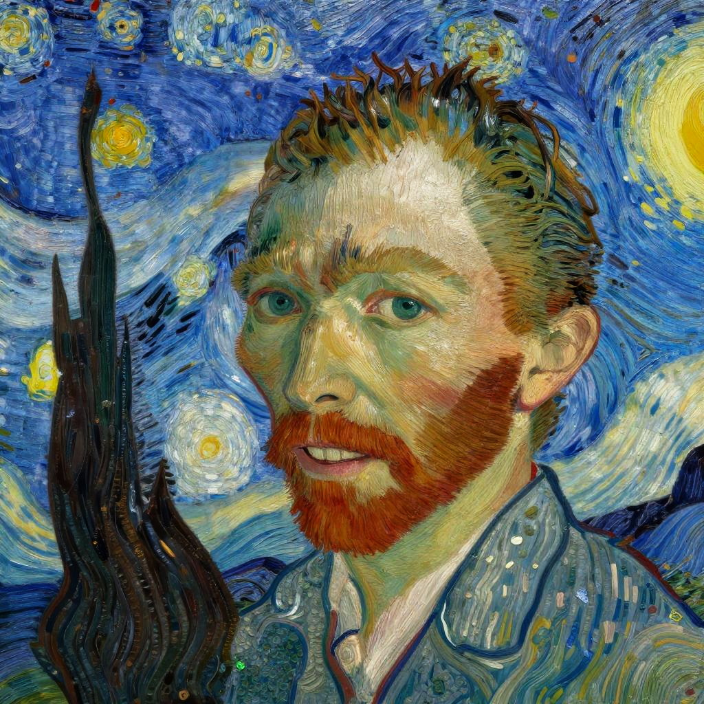 Vincent van Gogh's "Starry Night Pizza" painting: bearded man with red hair, blue shirt, eating pizza with basil and cheese