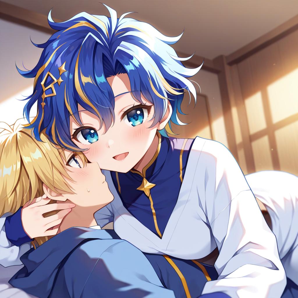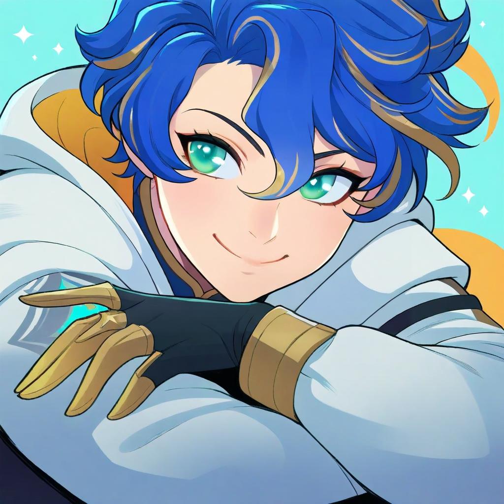 Astel leda, holostars, 1boy, aqua eyes, hair between eyes, green eyes, blue hair, blonde hair, streaked hair, short hair, long sleeves, virtual youtuber, virtual youtuber, by artist torisan, animagine