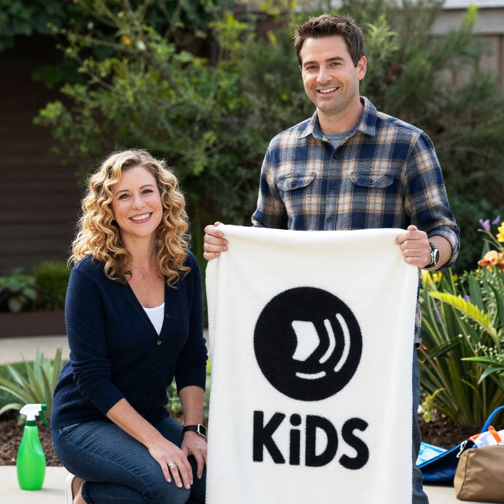 Photograph of a man and woman in a garden. Man with short brown hair, wearing a plaid shirt, holds a white blanket with "PBS KIDS" . Woman with curly blonde hair, wearing a navy cardigan, smiles while kneeling. Both look happy. Green plants and trees in the background. Man stands to the right, woman to the left. Objects include a green spray bottle and a bag on the ground. Bright daylight.