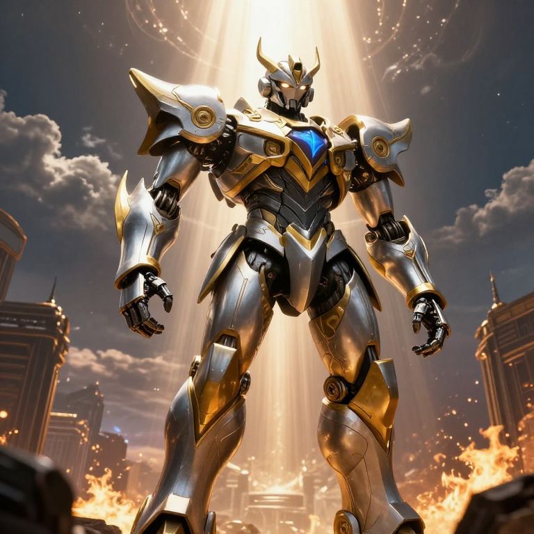 In this hyper-realistic, cinematic scene, a towering Titan mecha warrior stands majestically under a celestial light, its intricate details and baroque style design capturing the essence of fantasy and splendor. The mecha, painted in shades of silver and gold, is adorned with glowing eyes and mechanical arms, exuding an aura of power and strength. The epic setting is a city under fire, with buildings in the background and a towering structure that seems to reach towards the heavens. The lighting is dramatic, with a ray of light piercing through the clouds, casting a warm glow on the scene. The overall composition is dynamic, with the mecha positioned centrally, its form aligned with the celestial light, creating a sense of balance and harmony. The textures are photo-realistic, from the metallic sheen of the mecha to the intricate patterns on its armor, adding to the realism and depth of the image.
