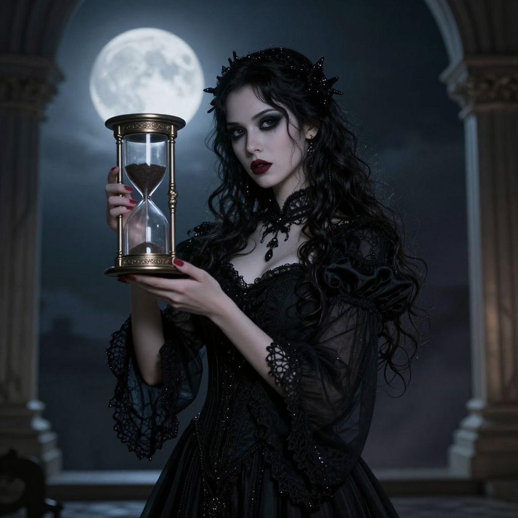 A gothic-inspired digital artwork featuring a darkly dressed woman holding an ornate hourglass, set against a dramatic backdrop of a full moon and architectural columns, evoking themes of time, mystery, and fantasy.