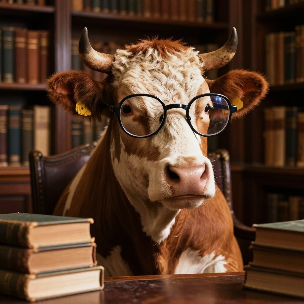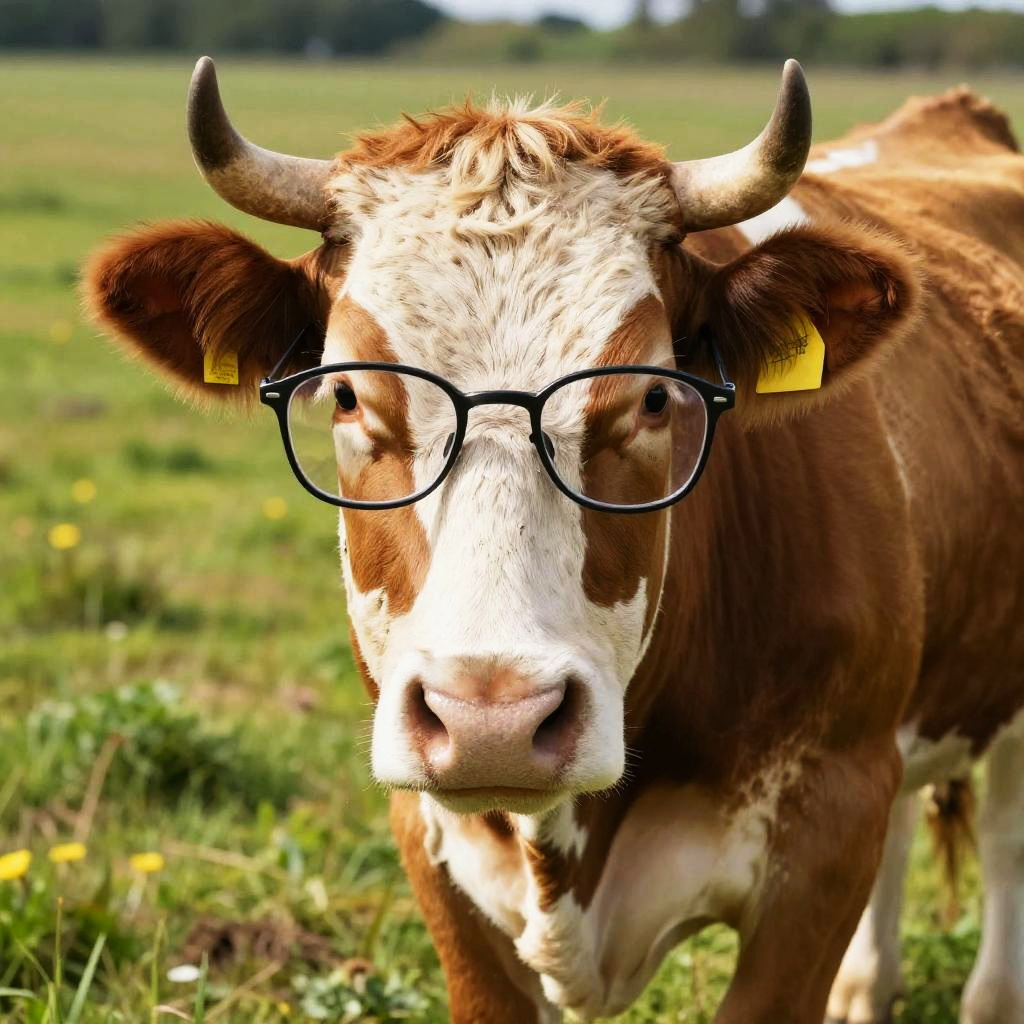 Cow wearing glasses in a futuristic cityscape, neon lights reflecting on the frames, cyberpunk style, highly detailed textures and vibrant color palette