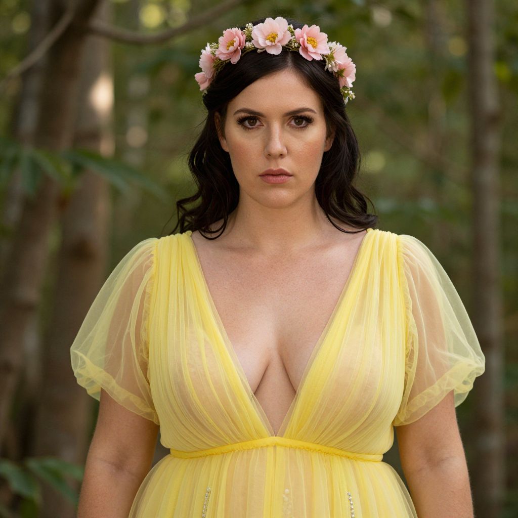 Photograph of a fair-skinned woman with dark, wavy hair, wearing a yellow, sheer, deep V-neck dress that reveals cleavage. She has a flower crown with pink and white flowers on her head. Her expression is neutral, with slightly parted lips and dark eye makeup. The background is a blurred forest with green foliage and tree trunks. The lighting is natural, highlighting her dress and face. The overall style is ethereal and somewhat fairy-tale-like.