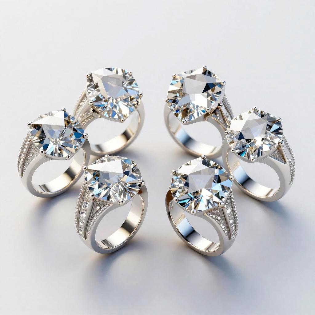 AI jewelry design visualization featuring a set of rings with geometric crystalline structures, blending digital and natural aesthetics, captured in a photorealistic style with reflective surfaces and soft ambient light, highlighting avant-garde innovation in luxury accessories.