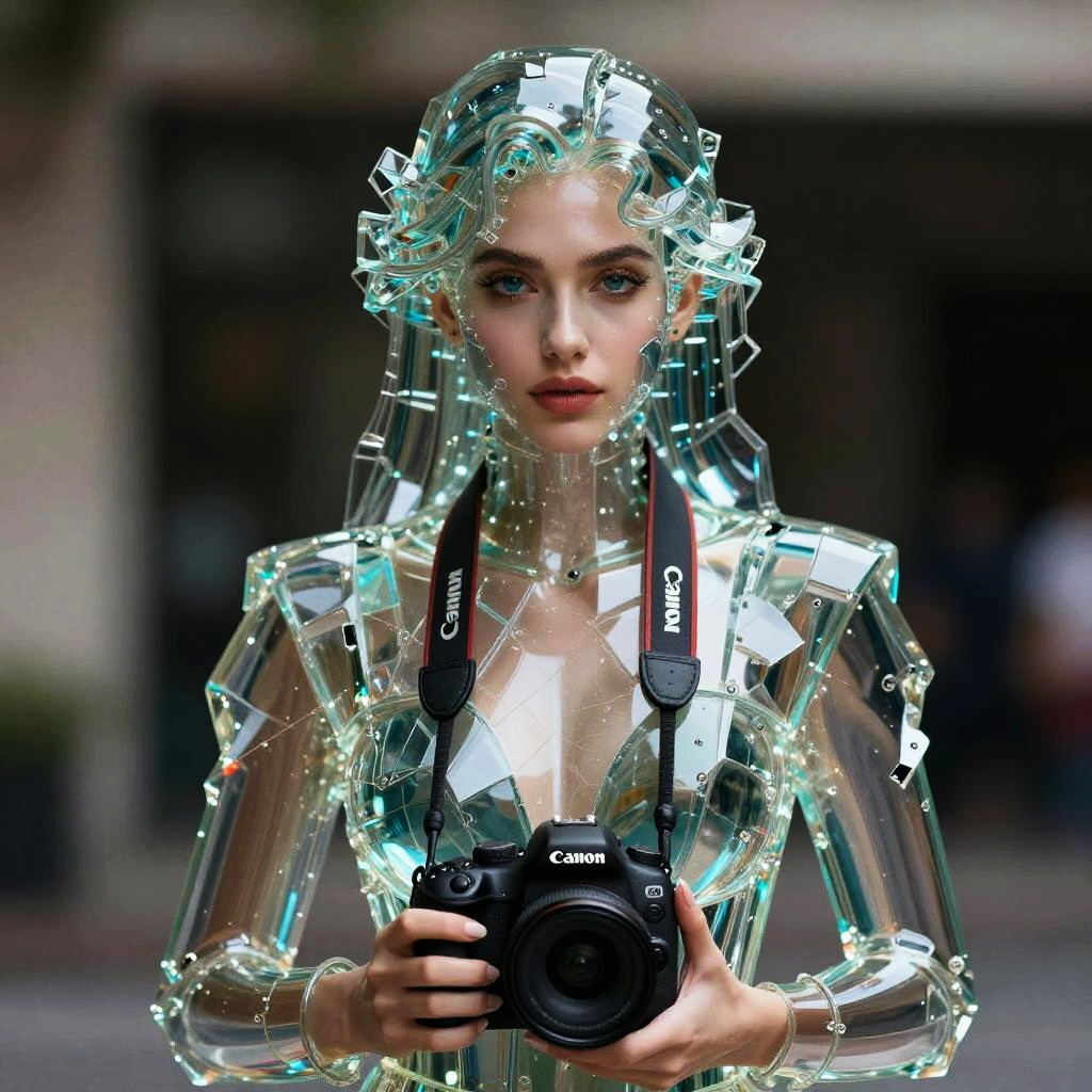 Photorealistic digital art of a woman with a crystalline, robotic body holding a Canon camera, featuring glowing blue-green light reflections.