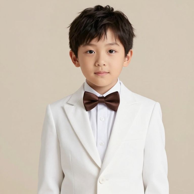 Wedding Fancy Dress, boy wearing a white suit and a brown bow tie