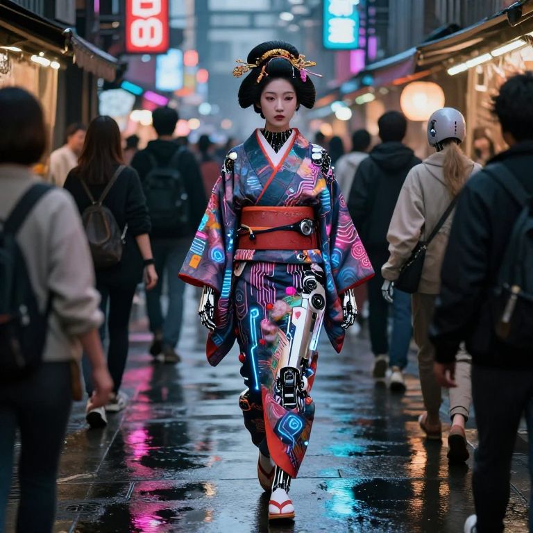 Futuristic Blade Runner geisha walking through a crowded cyberpunk street market, neon lights reflecting on wet pavement, her kimono interwoven with glowing circuits and robotic elements, surrounded by a diverse crowd of augmented humans and androids in a dystopian world.