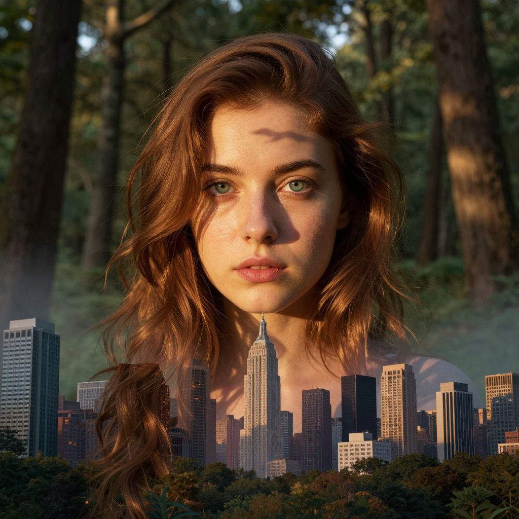 A mesmerizing double exposure portrait captures a young woman with cascading chestnut hair and enchanting green eyes amidst an ancient forest's embrace. The setting sun bathes her delicate features in golden light, casting shadows from swaying leaves that dance gracefully across her face. Her enigmatic gaze seems to conceal the secrets of the woods as she meets the camera's lens, exuding both wisdom and vulnerability. Overlaid behind her emerges a bustling city skyline, skyscrapers rising from the forest floor, creating a surreal yet harmonious fusion of nature's tranquility with urban vitality.