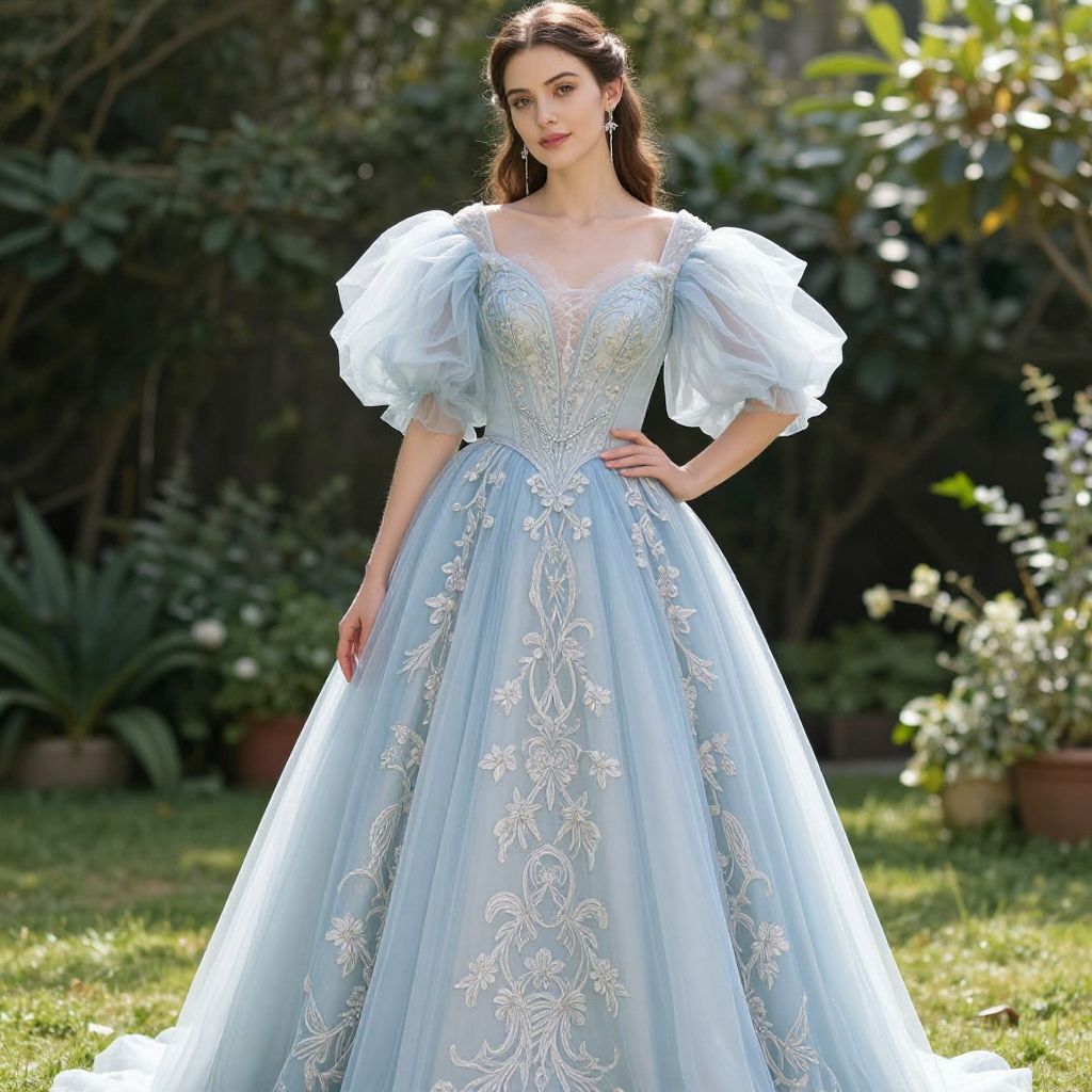 A woman stands gracefully in an elegant haute couture gown featuring intricate chiffon embroidery and fluffy puffed sleeves. The light blue dress with ornate floral patterns shines beautifully under the soft sunlight in a lush garden setting, highlighting a blend of classic and fantasy-inspired fashion.