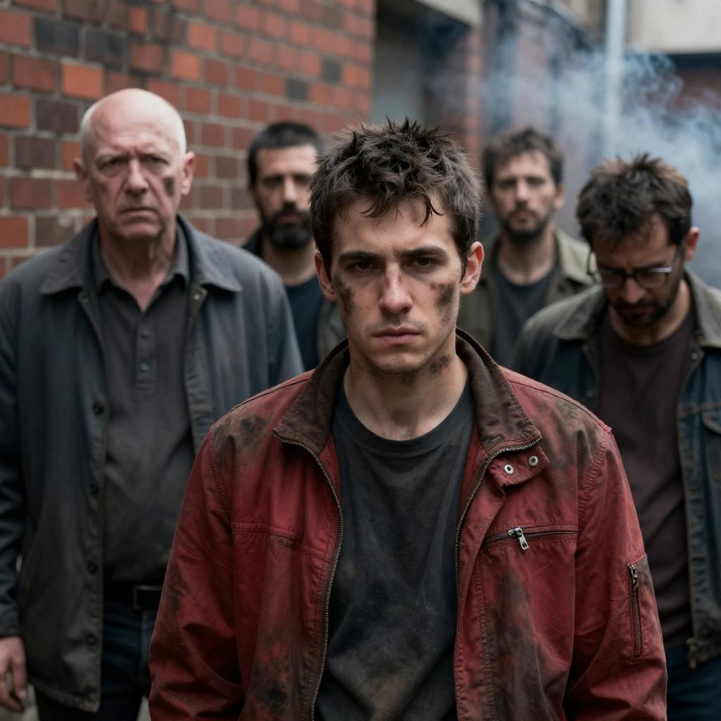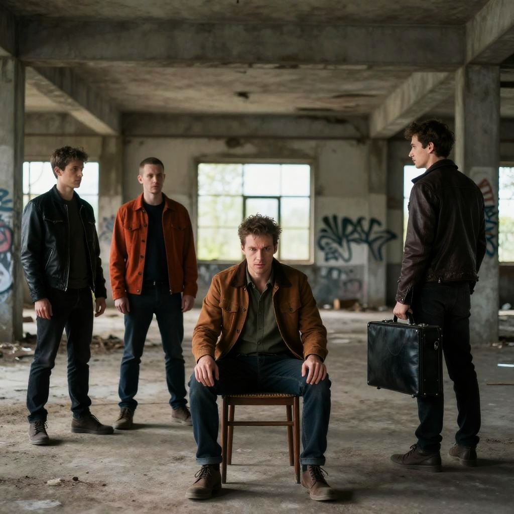 Abandoned warehouse interior with four men. Man on chair center, wearing brown jacket and green shirt, intense expression. Two standing men left, one in black jacket, one in orange jacket, neutral expressions. Man right, dark leather jacket, carrying black suitcase, back turned. Concrete pillars, graffiti on walls, dirt floor, large windows. Natural light.