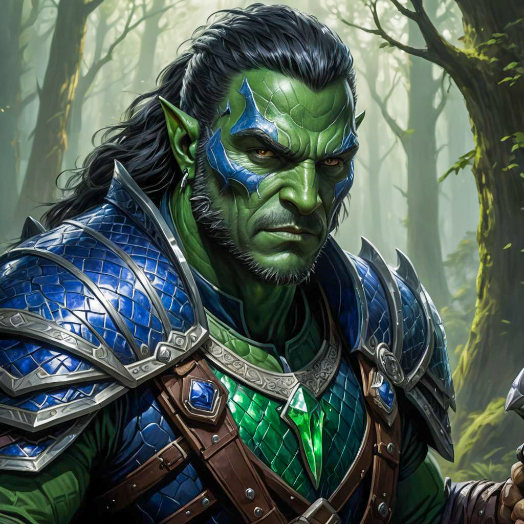 Detailed digital art of a male half-orc ranger from Dungeons & Dragons 5e, featuring green skin with elaborate facial markings, sharp horn accents, and intense eyes. The character wears blue chrome and emerald scaled armor with leather straps, holding a magical enchanted spear. The background shows a mystical forest environment, emphasizing a dark fantasy atmosphere with dramatic lighting and a sinister aura.