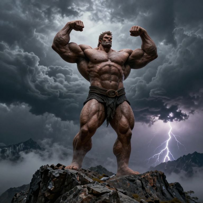 Muscular giant standing atop a rocky mountain peak, veins bulging, flexing immense arms under stormy skies, with swirling dark clouds and distant lightning, epic fantasy style, highly detailed muscles, dramatic lighting.