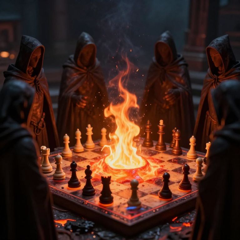 A fiery chessboard erupts with molten lava as spectral figures in dark cloaks gather around, their forms flickering like shadows cast by an eternal flame.