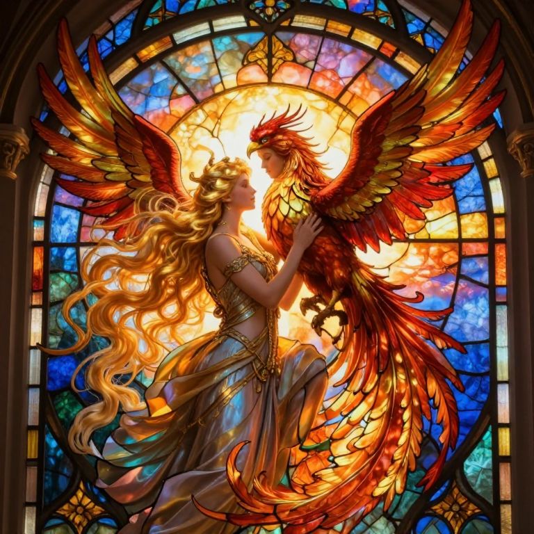 Imagine an enchanting portrait capturing a celestial maiden with cascading golden locks embracing a mythical phoenix. The scene is bathed in the warm glow of sunset, their intertwined figures illuminated by the divine light. Framed by an elaborate backdrop reminiscent of stained glass windows, this unique perspective reveals the lovers from above, as if witnessed through an enchanted prism casting radiant hues upon them. This mesmerizing image combines elements of romance and spirituality with awe-inspiring beauty, evoking a powerful emotional gradient that transcends reality.