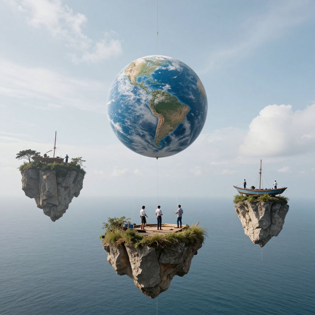 Suspended between earth and sky, fishermen navigate a surreal seascape where floating islands dangle like dreams, tethering the tangible world to the boundless expanse above, evoking a profound sense of wonder and the timeless pursuit of connection.