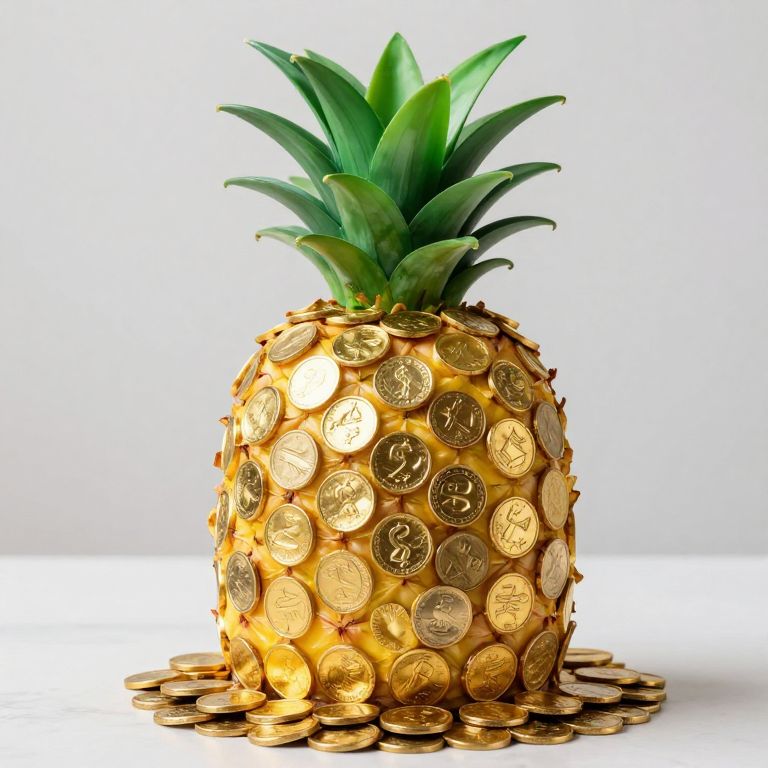 A whimsical pineapple cake crafted from cascading rows of golden coins, crowned with vibrant green leaves that seem to defy gravity, conjuring a surreal blend of treasure and tropical delight.